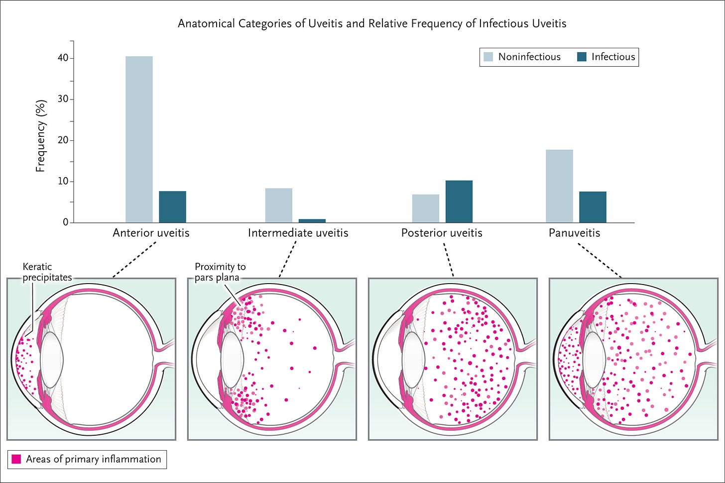 دانستن دستهبندی آناتومیکی یووئیت اطلاعاتی درباره احتمال عفونت و عوامل عفونی محتمل فراهم میکند. در بسیاری از مطالعات گسترده، عفونتها (اغلب به علت HSV) مسئول ۱۰ تا ۱۵ درصد از موارد یووئیت قدامی هستند، در حالیکه بیش از ۵۰ درصد از موارد یووئیت خلفی به علت عفونتاند، که شایعترین آنها توکسوپلاسموز است (شکل ۴). فرکانس برخی از پاتوژنها با توجه به موقعیت جغرافیایی متفاوت است. به عنوان مثال، سل تنها عامل حدود ۰٫۵ درصد از موارد یووئیت در ایالات متحده است، ولی در هند ۵ تا ۲۰ درصد از موارد را شامل میشود.