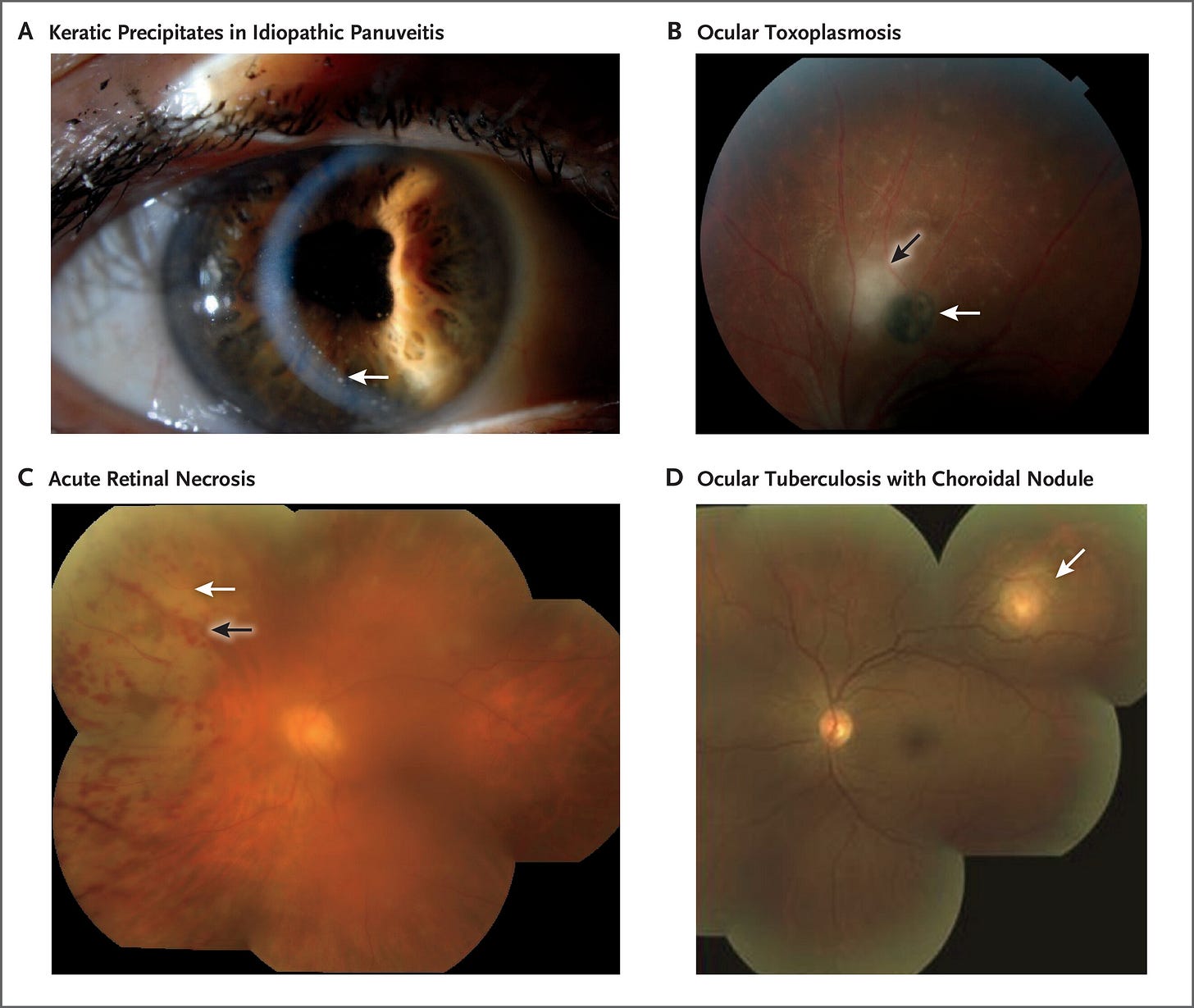 یووئیت بر اساس محل اصلی التهاب به چند دسته تقسیم میشود (شکل ۴). یووئیت قدامی (anterior) شایعترین نوع است، اما یووئیت خلفی (posterior) و پانیووئیت (panuveitis) معمولاً تهدیدکنندهتر برای بینایی هستند. در یووئیت قدامی، التهاب عمدتاً (یا تنها) در بخش قدامی چشم وجود دارد، و اغلب رسوبات کراتیکی (keratic precipitates) دیده میشوند؛ اینها خوشههایی از گلبولهای سفید هستند که روی اندوتلیوم قرنیه تجمع یافتهاند (شکل 5A). این رسوبات ممکن است بزرگ (گرانولوماتوز) یا ریز (ظریف) باشند. علیرغم نام "گرانولوماتوز"، در رسوبات گرانولوماتوزی، گرانولوم واقعی وجود ندارد، اما این رسوبات با بیماریهای گرانولوماتوز مثل سارکوئیدوز و سل همراه هستند.
