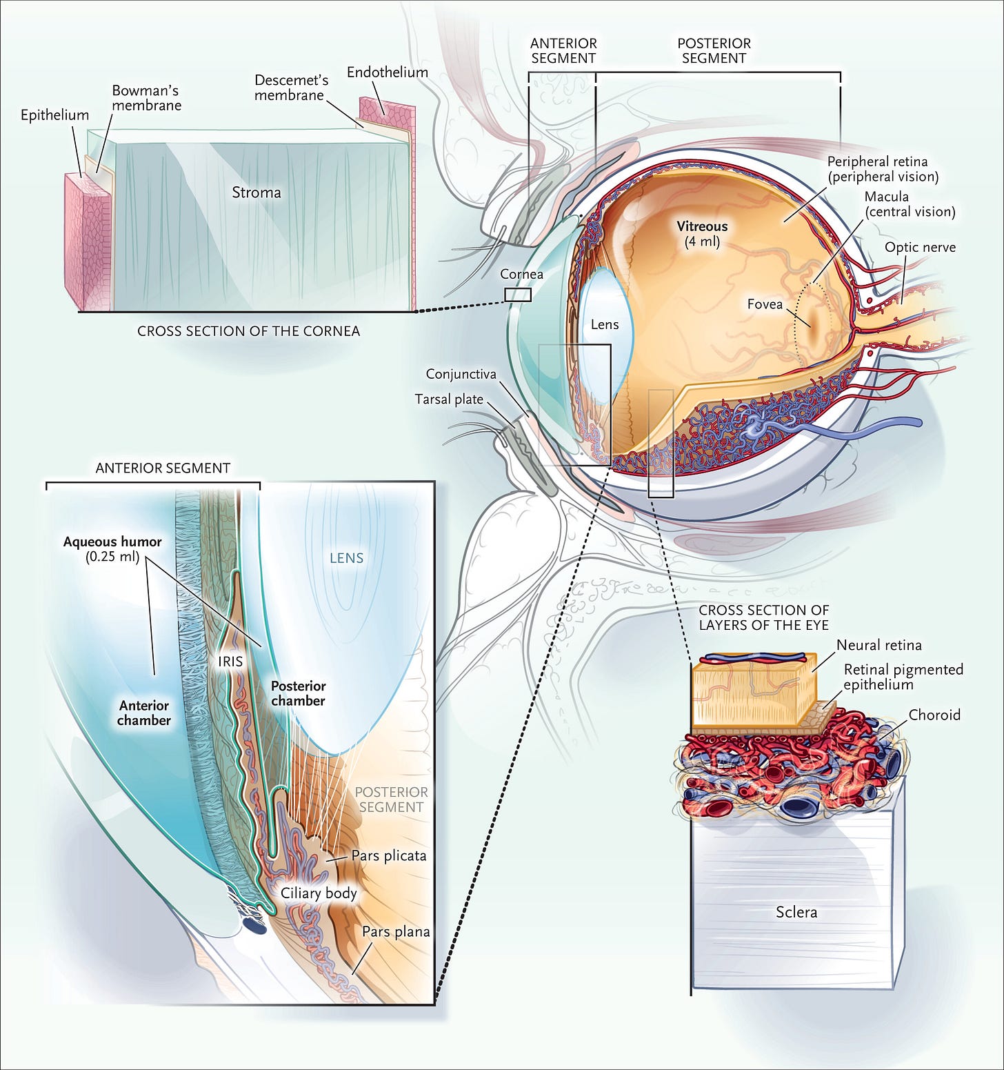 این مرور، خلاصهای از همگیریشناسی (اپیدمیولوژی)، تشخیص، و درمان عفونتهای چشمی ارائه میدهد. شکل ۱ آناتومی چشم را در ارتباط با عفونتهای چشمی نشان میدهد. جدول S1 در ضمیمه تکمیلی، که همراه با متن کامل مقاله در سایت در دسترس است، ویژگیهای میکروبیولوژیکی، مشخصات بالینی، و درمان این عفونتها را خلاصه میکند